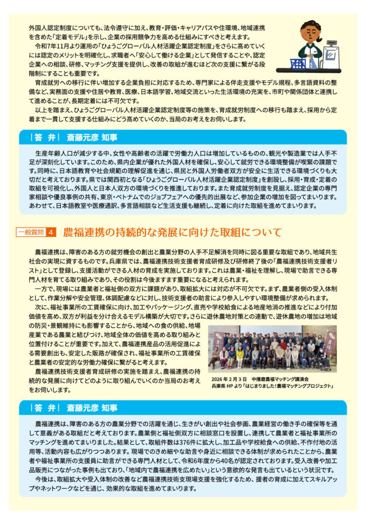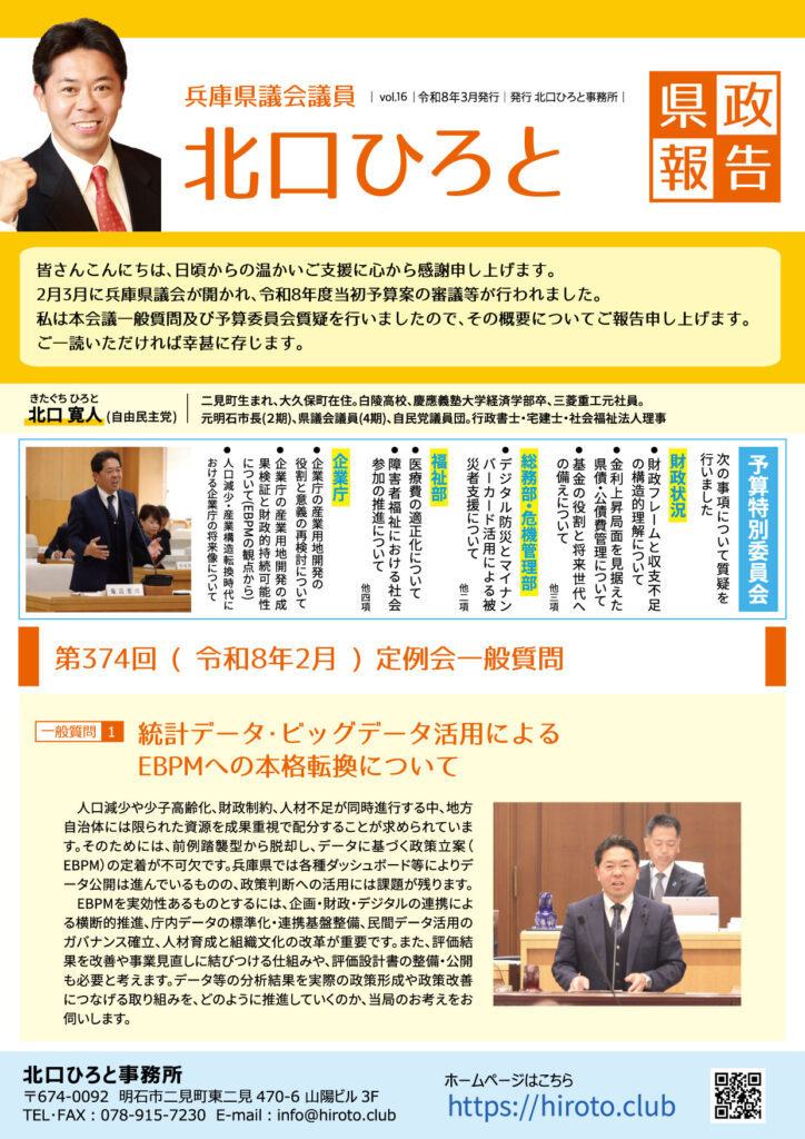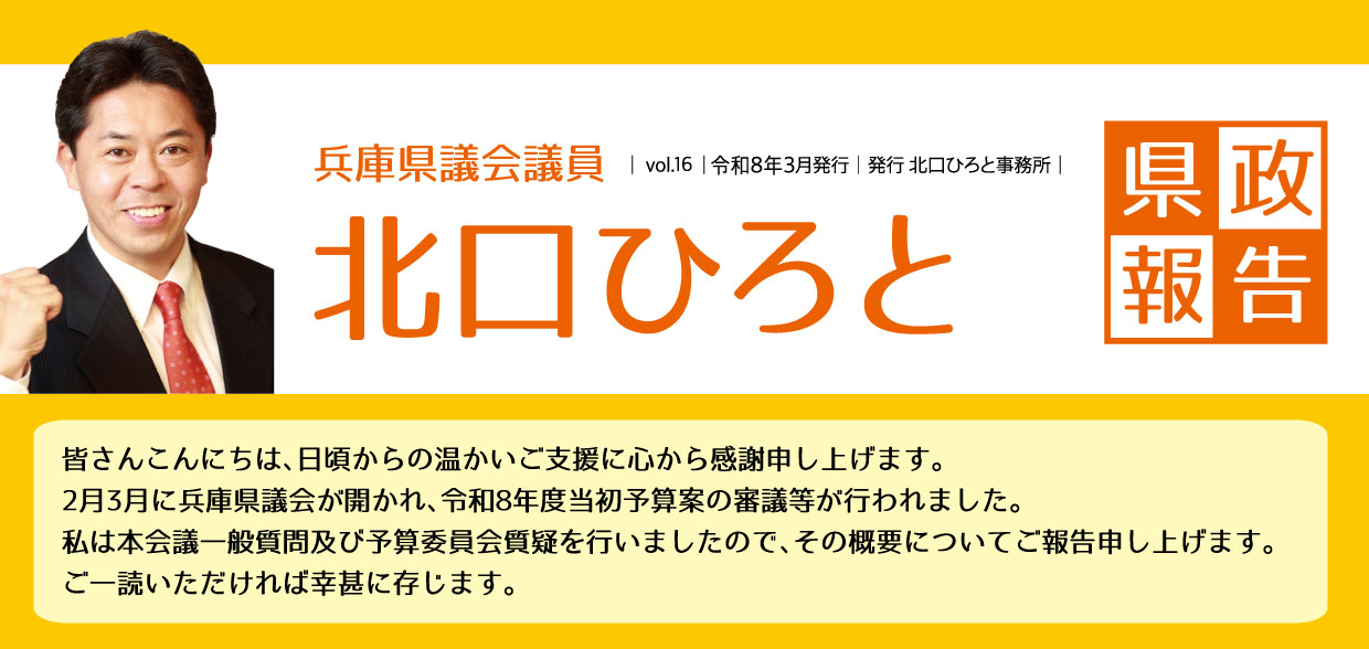県政報告誌VOL.16を発行しました 投稿日 2026年3月15日 更新日 2026年3月31日 著者 北口ひろと カテゴリー お知らせ 皆さんこんにちは、日頃からの温かいご支援に心から感謝申し上げます。2月3月に兵庫県議会が開かれ、令和8年度当初予算案の審議等が行われました。私は本会議一般質問及び予算委員会質疑を行いましたので、その概要についてご報告申し上げます。ご一読いただければ幸甚に存じます。 PDF
